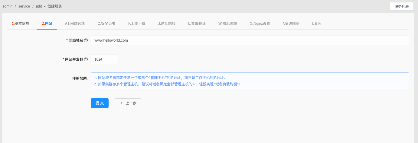 说明:{w:domains:w}、{w:listenLines:w}这两个变量是URLOS自带的,分别是域名、监听的端口号。