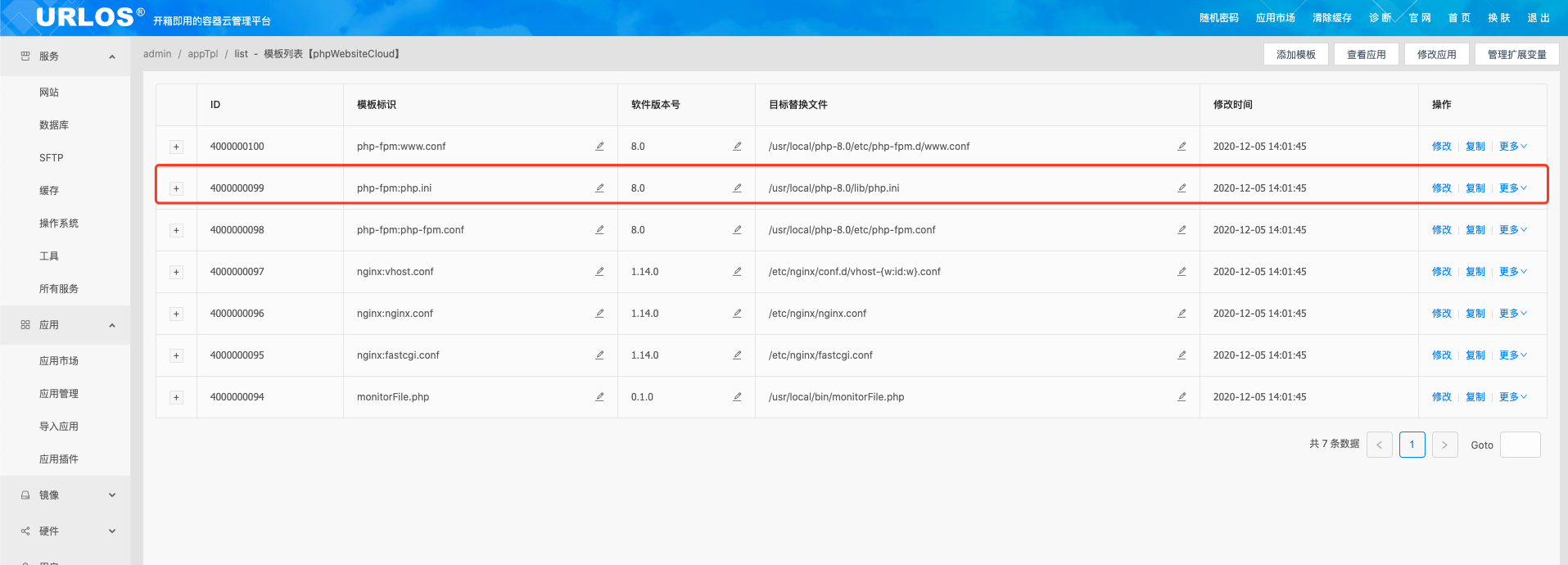 首先,进入应用管理,找到PHP-8.0-网站环境(新),选择 更多 -> 复制应用