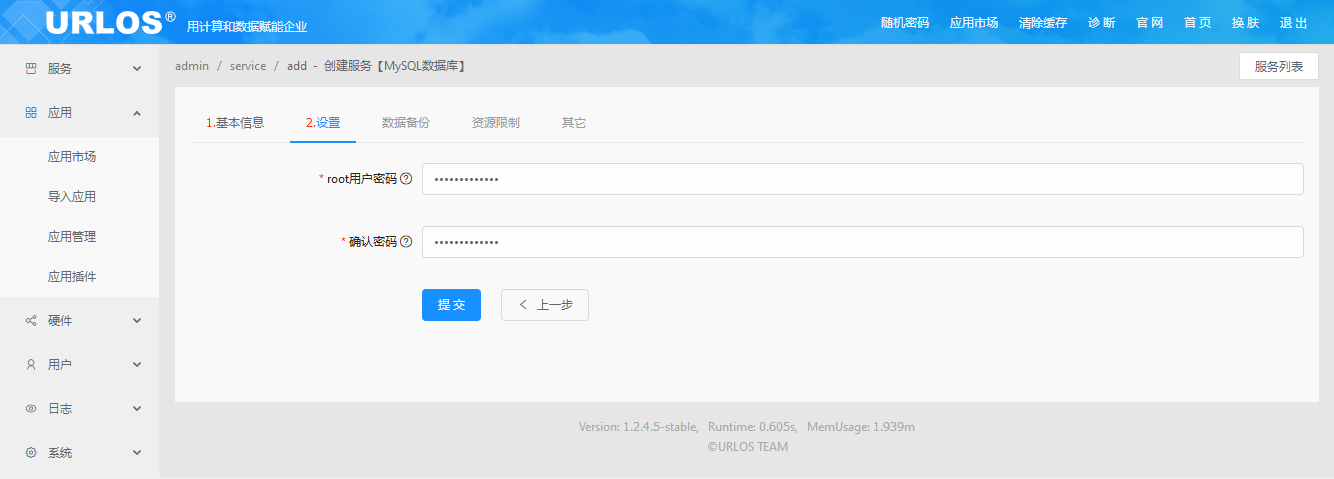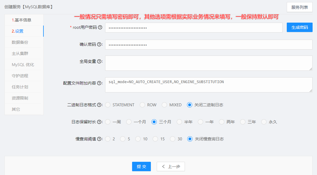 在基本信息中填写服务名称、选择运行主机、部署方式选择智能部署,服务端口即对外服务端口,一般默认填写3306,然后设置数据库密码,点击提交: