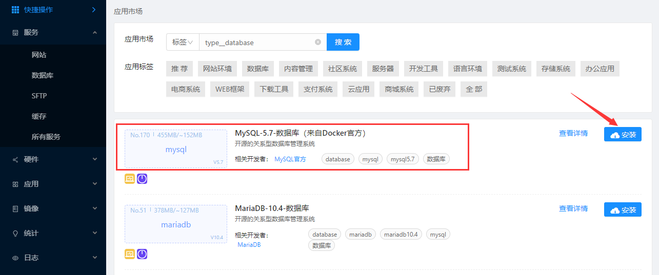 在添加主机后,我们正式进入网站部署流程,一个动态网站必须有数据库的支持,那么我们需要在URLOS中安装一个数据库服务,打开 “服务 > 数据库”,点击“安装应用”跳转至数据库应用界面。