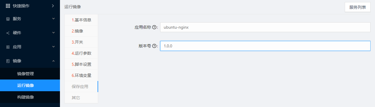 在此步骤中,需要填写的项目有服务名称,即启动之后的容器名称,选择容器运行在哪台主机上,以及端口映射(如无需映射,则可不填):