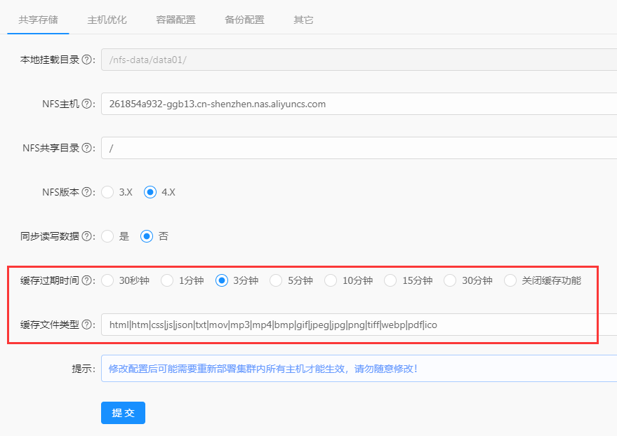 在 集群管理 中找到挂载了NFS的集群,然后修改集群,在【共享存储】中开启存储过期时间,填入需要缓存的静态文件类型。注意,NFS文件加速只缓存不大于10MB的小文件。